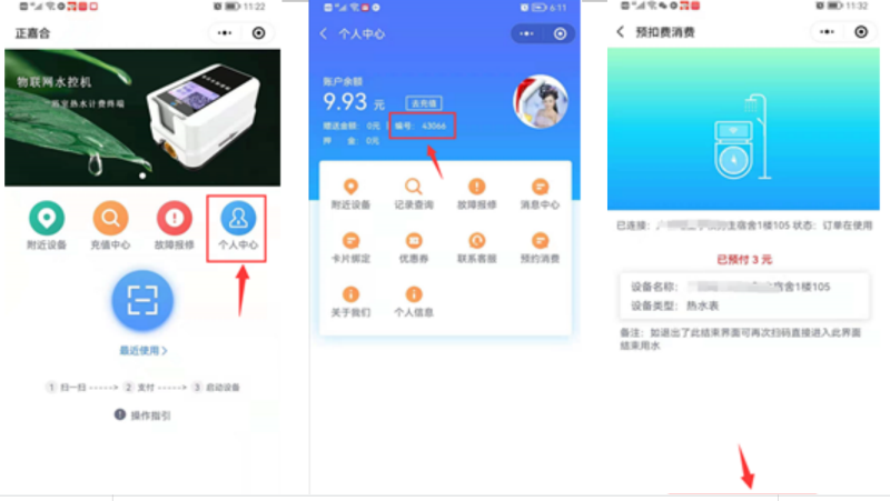 使用热水方式:在微信进入“正嘉合物联”小程序后,在个人中心查看(注:新校园卡充值蓝牙联网水控洗浴设备目前还在对接中,待对接完成后将投入使用)。蓝牙联网水控设备充值操作如下图所示: