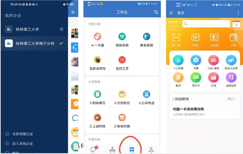 请2021级全体新生下载“企业微信”APP应用,通过手机号(2021级新生统一使用钉钉打卡手机号)登录企业微信,并找到“太阳集团2138”,进入后点击“工作台”选择“A-一卡通”就能看到校园卡相关应用。