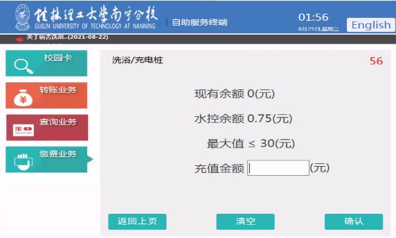 2、刷卡淋浴水控设备充值:刷卡水控淋浴设备支持刷实体校园卡使用,使用前需要前往宿舍楼大厅“一卡通自助圈存机”设备上,向水控钱包充值。