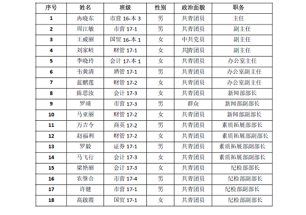 根据《太阳集团2138学生干部管理条例》的文件精神和相关要求,本着自愿、公平、公开的原则,经个人申请、组织推荐、现场面试等全面考察,结合我系实际,经系团总支研究讨论,上报党总支同意,现将我系学生公寓管理委员会第一届委员任职名单公示如下: