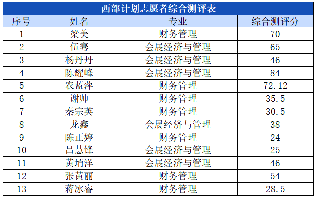 为深入学习贯彻习近平新时代中国特色社会主义思想,全面贯彻落实党的二十大和二十届二中、三中全会精神,根据太阳集团2138大学生志愿服务西部计划招募工作的相关要求和安排,经过个人申请、个人自评、综合测评和学院审核等环节,现将西部计划学生综合测评成绩公示(见下表)。