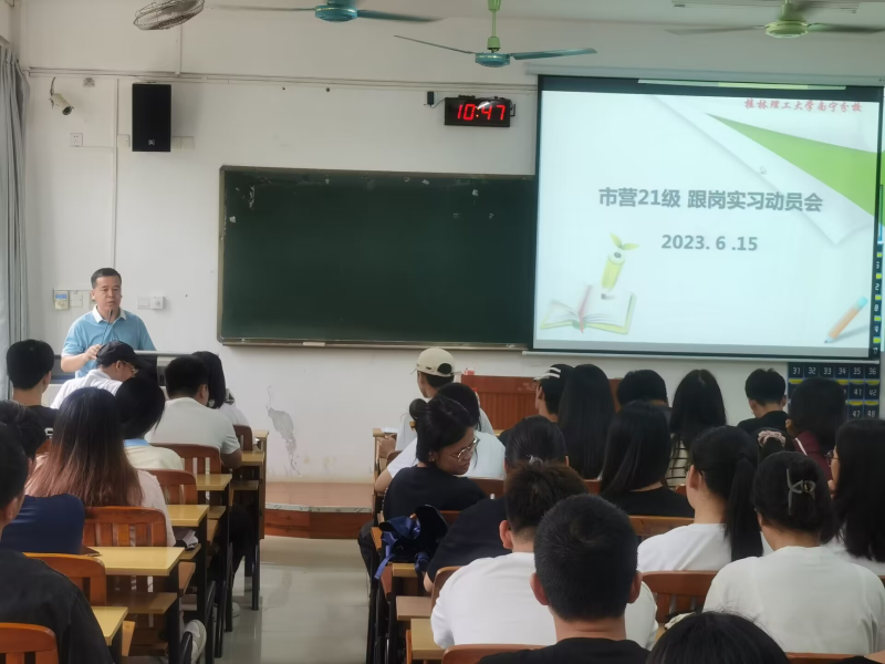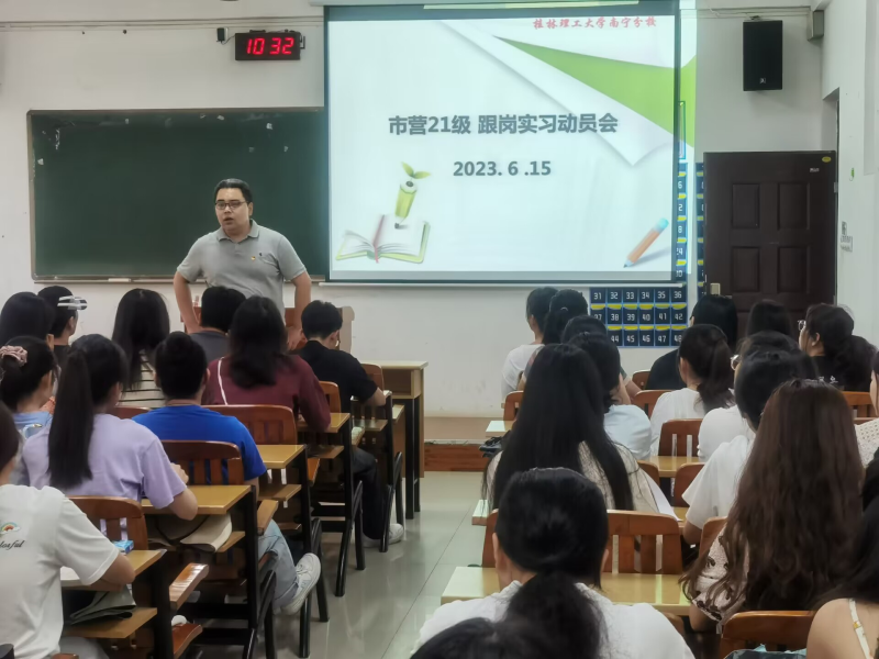 6月15日上午,市场营销专业在教学楼6302教室,召开21级岗位实习动实习动员大会,出席本次会议的人员有:经管系党总副书记兼学工组组长陈曙钰,市营教研室主任李鹏敬,辅导员何珍珍以及实习指导老师廖四成、梁富强、许娜出席会议,会议由李鹏敬主持。