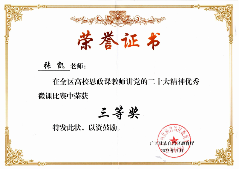 近日,广西壮族自治区教育厅公布2023年全区高校思政课教师讲党的二十大精神优秀微课评选活动获奖名单。经初赛、决赛的激烈角逐,我系张凯老师主讲的《牢“三个务必” 奏响青春奋进三部曲》荣获三等奖。