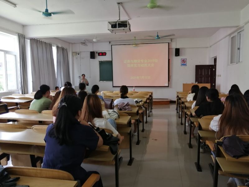 7月12日,证券教研室组织开展2019级证券专业顶岗实习动员大会。教研室主任李琳丽,教研室教师唐钢、丘凌、文皓程、朱柳和张玲等老师出席会议,2019级证券专业全体同学参加动员大会。