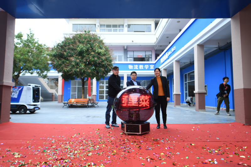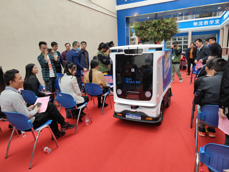 最后,政校企三方代表共同按下启动球,为“阿里菜鸟数智商学院”揭牌。仪式结束后,我系副主任劳国炜带领与会成员观览华南地区首台智能快递无人车和阿里菜鸟数智商学院。