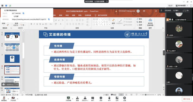 课上,辅导员从艾滋病的发病历程和临床表现、艾滋病的播途径、全球及我国艾滋病的最新信息以及大学生怎样预防艾滋病感染等内容切入,阐述了艾滋病病毒的传播途径及危害,并指出大学生群体不仅是艾滋病传播的高风险人群,同时也是艾滋病预防与控制的实践者,呼吁广大青年学生群体积极参与艾滋病防范学习,了解艾滋病病毒防范举措,做到“要想爱,先懂艾”,做自己健康的第一责任人。