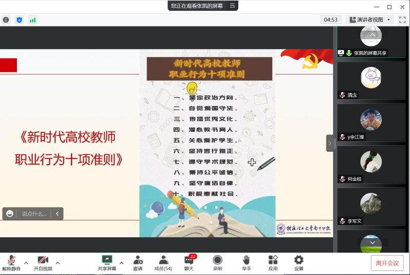 张凯书记领学了党的二十大精神、《新时代高校教师职业行为十项准则》。她强调,广大教职工要切实提高思想认识、强化学习自觉,深入学习领会党的二十大报告丰富内涵和实践要求,牢记坚持为党育人、为国育才的使命;要把教书育人和教师的自我修养进行深度结合,老师们应严于律己,时刻自重、自省、自警、自励,加强自身修养,做到言传身教、榜样示范,切实成为学生健康成长的指导者和引路人。