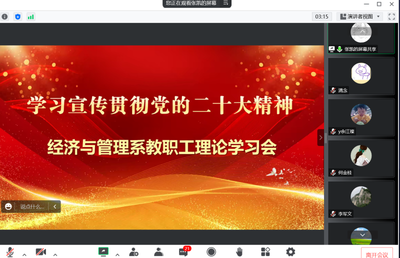 12月1日,经济与管理系召开线上全系教职工理论学习专题会。系部领导班子及全体教职工参加会议,会议由系党总支书记张凯主持。