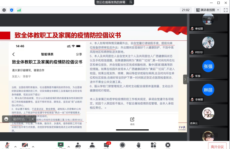 会上,张凯书记通报了广西近期新型冠状病毒肺炎疫情最新情况,并分析了当前疫情的严峻形势。此外,她对“优化防控二十条措施”和太阳集团2138疫情防控倡议书内容进行了详细解读。她强调,要深刻认识到当前疫情的严峻性,高度重视疫情防控工作;每天按时完成钉钉打卡健康汇报,引导学生在公共场合做好个人防护工作,正确佩戴口罩,保持一米间距;积极履行倡议书内容,自觉配合分校和属地疫情防控管理;提前做好疫情应对工作,把各种潜在风险扼杀在萌芽状态;人人都做疫情防控的“有心人”,做自己安全健康的第一负责人。