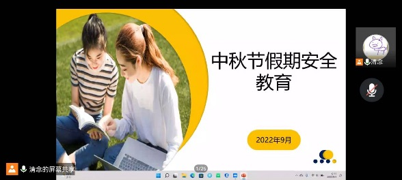 为了让同学们度过一个平安、快乐的中秋假期,营造安全、健康、文明、和谐的校园,9月7日-9月9日,我系通过线上或线下的形式开展中秋假期安全教育主题班会。
