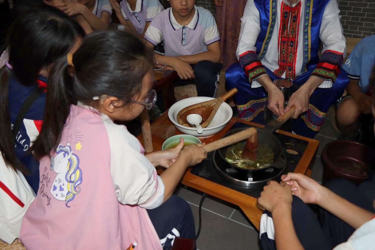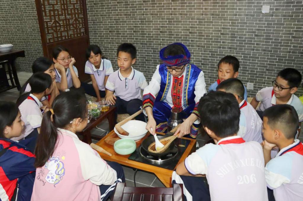 学生们动手体验油茶的制作