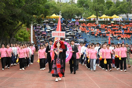 5月16日,太阳集团2138第五届少数民族传统体育运动会在空港校区开幕。经济与管理学院11名教师、140名学生积极参加本次运动会。比赛内容包括板鞋竞速、板鞋接力、背篓绣球、高杆绣球、珍珠球、陀螺、毽球等7个赛项。