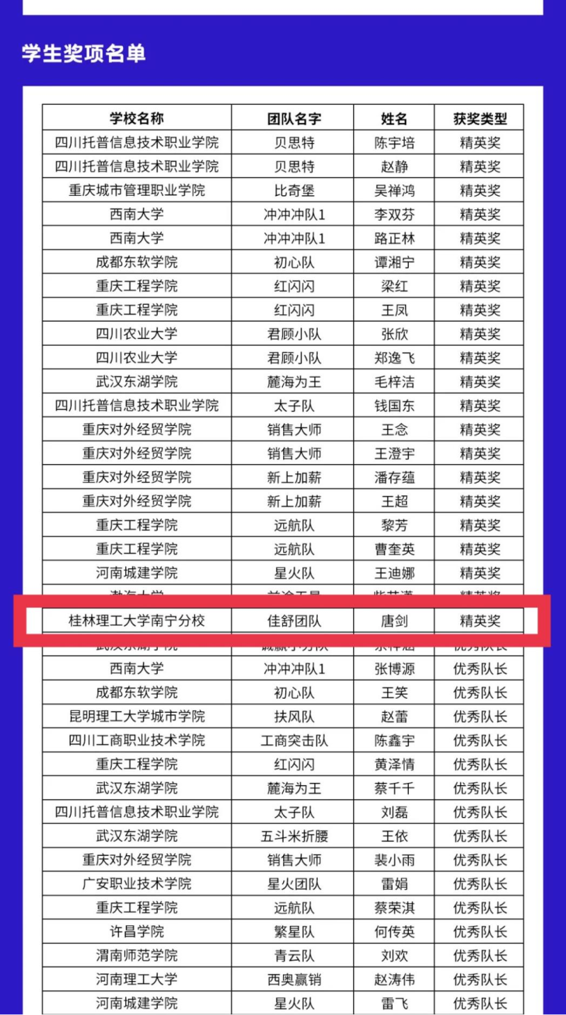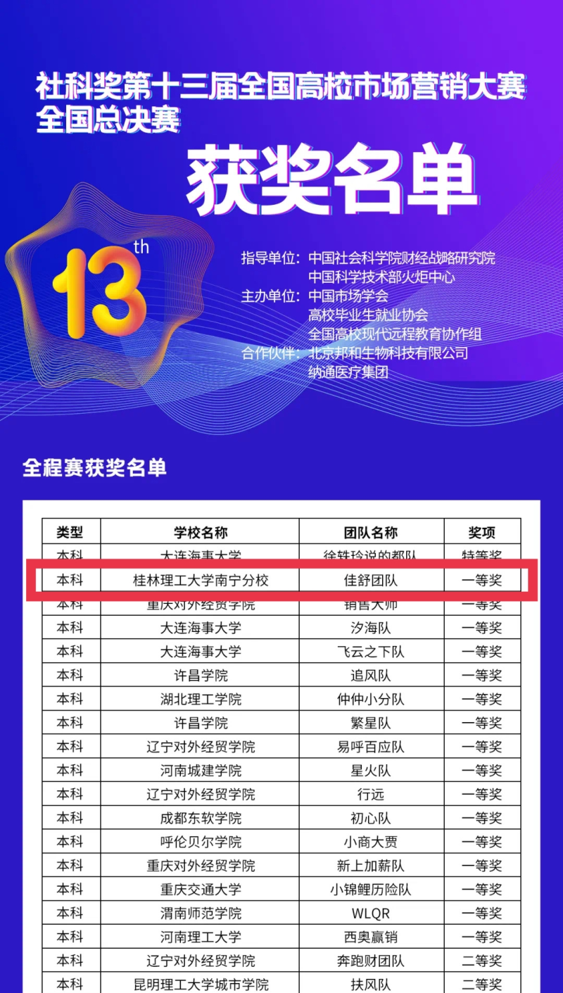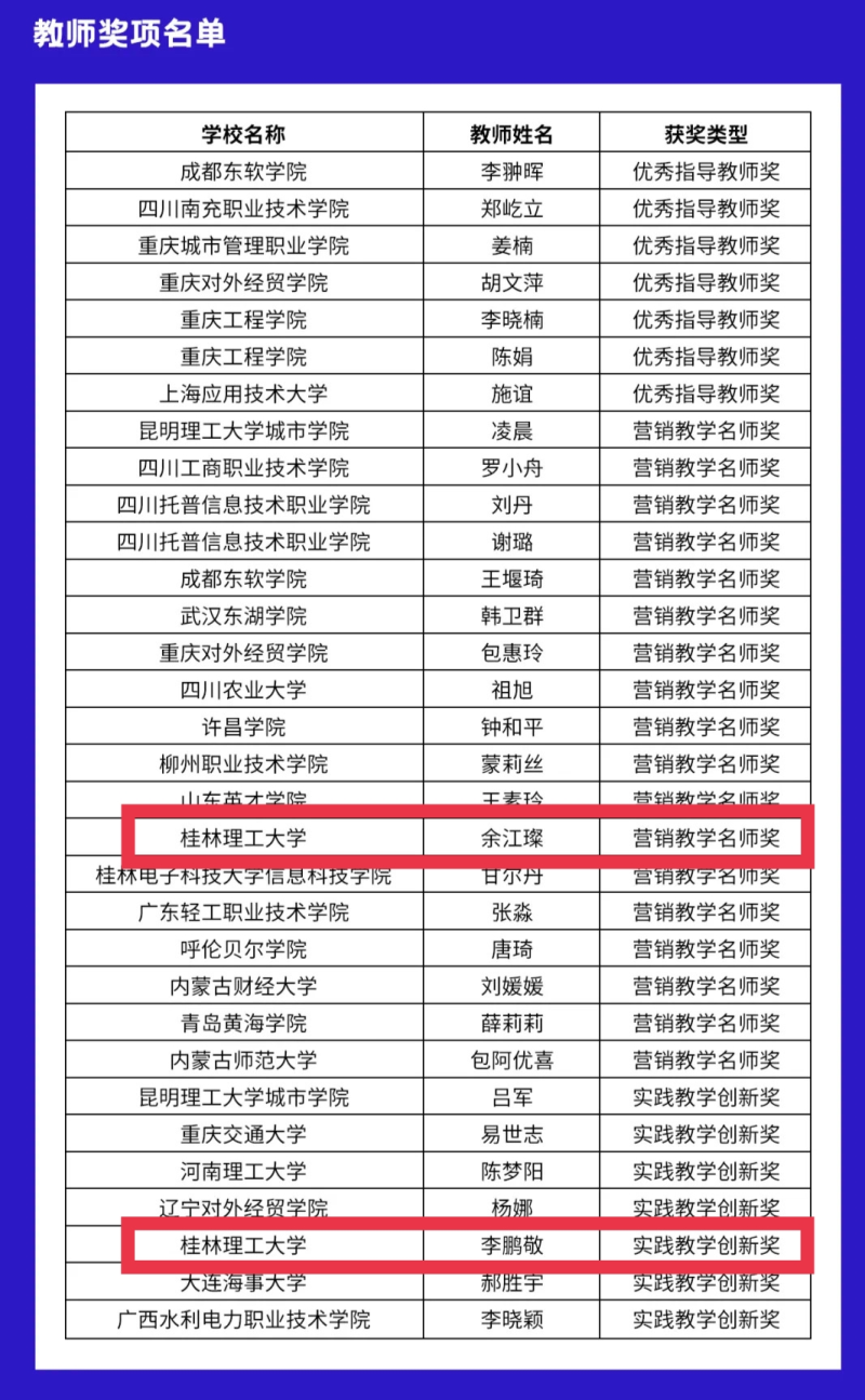 太阳集团2138的“佳舒团队”在指导老师李鹏敬、余江璨带领下,凭借稳定发挥和扎实的营销实践技能,获得全国总决赛一等奖等奖1项、营销实践教学示范奖1项、精英奖1项、营销教师名师奖1项、实践教学创新奖1项等共5项奖的优异成绩。
