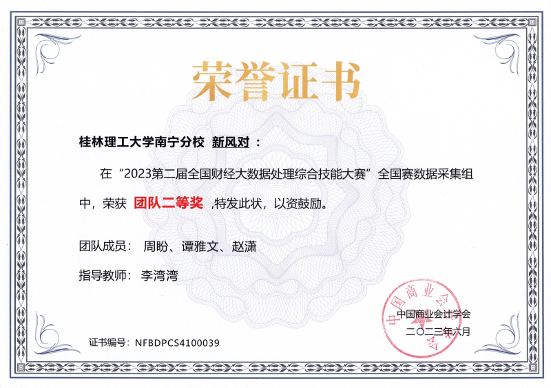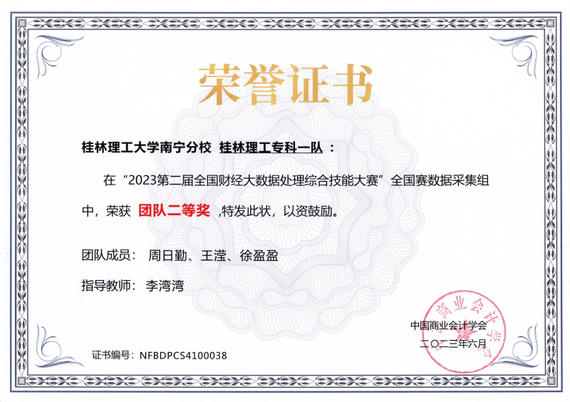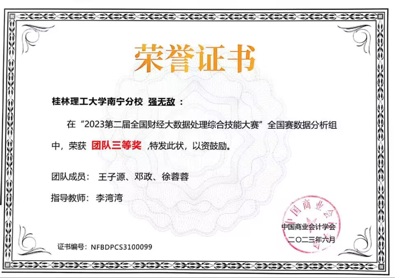 近日,2023年第二届全国财经大数据处理综合技能大赛成绩揭晓。我校经济与管理系指导教师李湾湾指导的大数据与财务管理(专科)专业、财务管理(本科)专业的参赛队伍表现优异,分别获得全国数据采集组团队二等奖两项和全国数据分析组团队三等奖一项的好成绩。