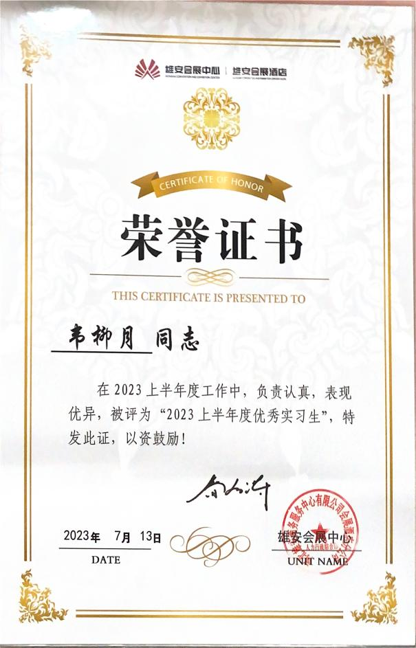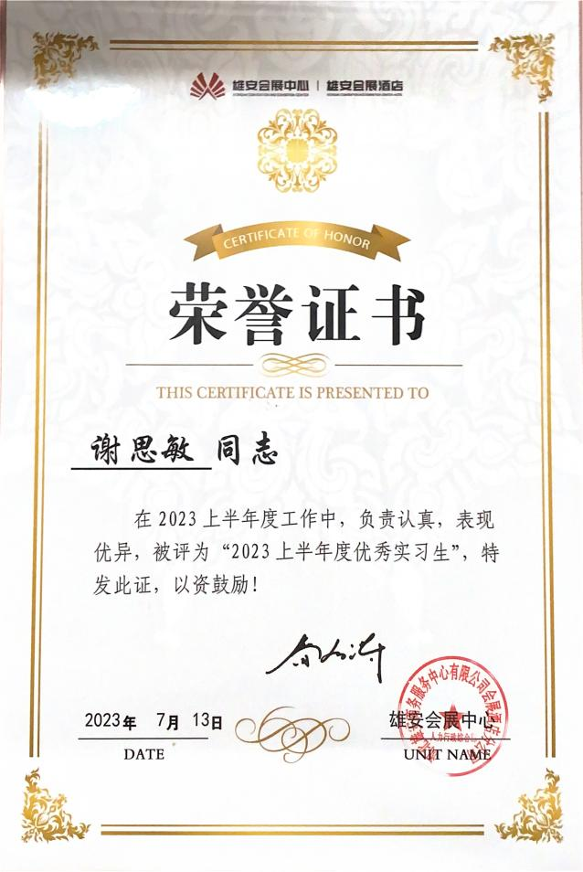 在为期一个学期的实习过程中,学生累计参与国部级会议接待活动共二十多场。习近平总书记在河北雄安新区考察并主持召开高标准高质量推进雄安新区建设座谈会期间,学生以热情饱满的姿态提供专业、周到的服务,展现了桂工学子昂扬向上的奋斗品质,获得用人单位好评。在2023年上半年度雄安会展中心优秀实习生评选活动,我系会展经济与管理专业韦柳月、谢思敏2名学生被雄安会展中心评为“优秀实习生”。韦柳月、谢思敏同学在实习过程中踏实肯干、认真细致的工作态度及表现为学弟学妹们树立了榜样。实习单位的认可更是对我校会展经济与管理专业人才培养工作的肯定。