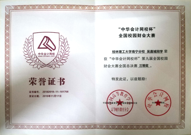 “中华会计网校杯”全国校园财会大赛全国总决赛三等奖