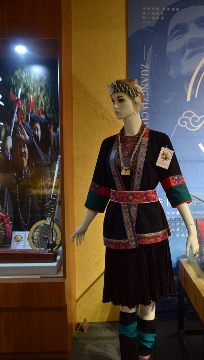 三江侗族女子穿长衫短裙,其长衫为大领对襟式,领襟、袖口有精美刺绣,对襟不系扣,中间敞开,露出绣花围兜,下着青布百褶裙和绣花裹腿、花鞋,头上挽大髻,插饰鲜花、木梳、银钗等。洛香妇女春节穿青色无领衣,围黑色裙,内衬镶花边衣裙,腰前扎一幅天蓝色围兜,身后垂青、白色飘带,配以红丝带。