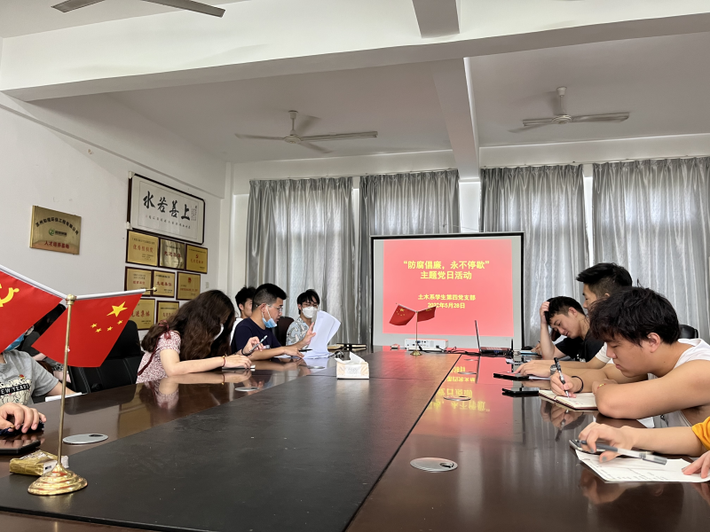 为打好党风廉政建设和反腐败斗争攻坚战持久战,土木与测绘工程系学生第四党支部于2022年5月30日中午12点在6406室开展“反腐倡廉,永不停歇”主题党日活动。本次会议由支部组织委员汤永香同志主持。