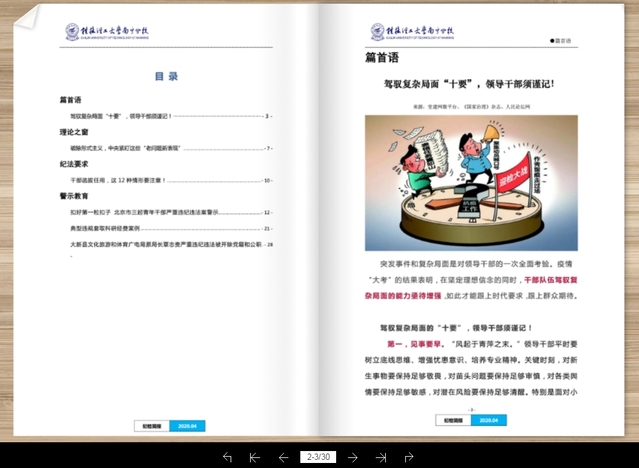 分校纪委运用信息化编辑技术,创刊集动画、声效于一体的《纪检简报》电子杂志,通过勤廉榜样案例弘扬正能量,与榜样对标对表;以案说纪、说法、说德、说责,让监督带电长牙,持续加强校园讲政治、守规矩的氛围。