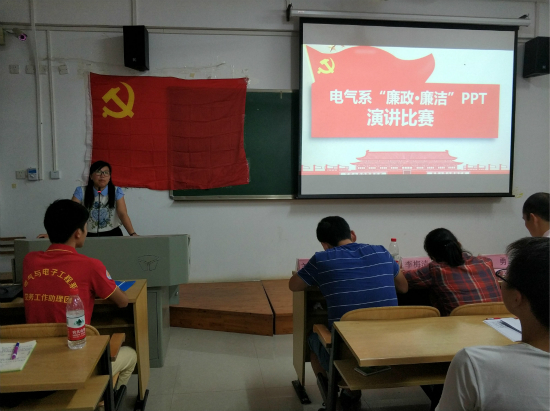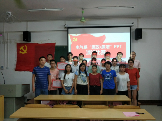 为全面提高大学生的思想道德素质,建立健全拒腐防变教育长效机制,积极配合分校深入开展大学生廉洁教育系列活动,丰富大学生的校园文化生活,普及廉洁知识,提高廉洁素养。电气与电子工程系于2018年6月19日19点30分,在2208教室成功举办了廉政廉洁PPT主题演讲比赛。我系党总支书记黄薇薇老师,党总支副书记兼学工组长罗勇老师,辅导员刘恒老师,梁宇老师,李梅清老师,章丰慧老师比出席了本次比赛并担任评委,参加比赛的有12组选手,全体积极分子作为观众。