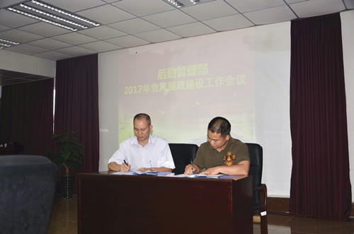 会上,后勤管理部主任与副主任、副主任与食堂采购负责人分别签订了2017年党风廉政建设工作责任状。