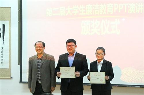 为深入贯彻落实党的十八大和十八届四中、五中全会精神,培育风清气正的校园文化,建设和谐校园,引领廉荣贪耻的社会风尚。学校党委、纪委举办了第二届大学生廉洁教育PPT演讲比赛。近日,比赛决赛在启智楼208教室落下帷幕。经过激烈比拼,土木与测绘工程系黄月凤 、劳庭正之同学制作的PPT作品荣获第一名,黄月凤同学获得优秀演讲选手第一名。
