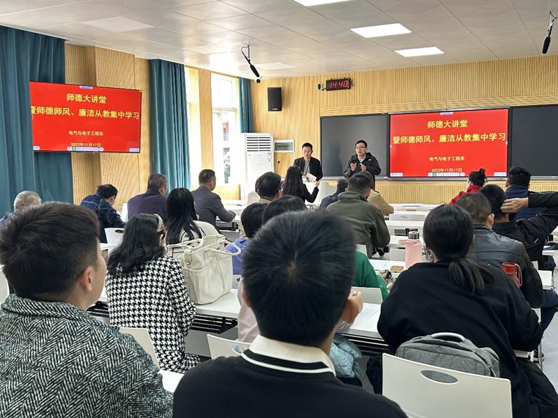 2023年11月17日,电气与电子工程系在践行楼2301教室召开师德大讲堂暨师德师风、廉洁从教集中学习专题会议。该系全体教职工参加会议。