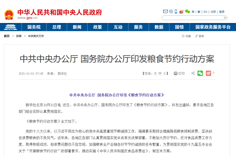 近日,中共中央办公厅、国务院办公厅印发了《粮食节约行动方案》,单列一条对加强公务活动用餐节约方面作出明确规定。方案提出,“各级党政机关、国有企事业单位要落实中央八项规定及其实施细则精神,切实加强公务接待、会议、培训等公务活动用餐管理。按照健康、节约要求,科学合理安排饭菜数量,原则上实行自助餐。严禁以会议、培训等名义组织宴请或大吃大喝。”这就要求,党政机关和公职人员要强化勤俭节约的意识,严格落实相关规章制度,做节约粮食的表率。