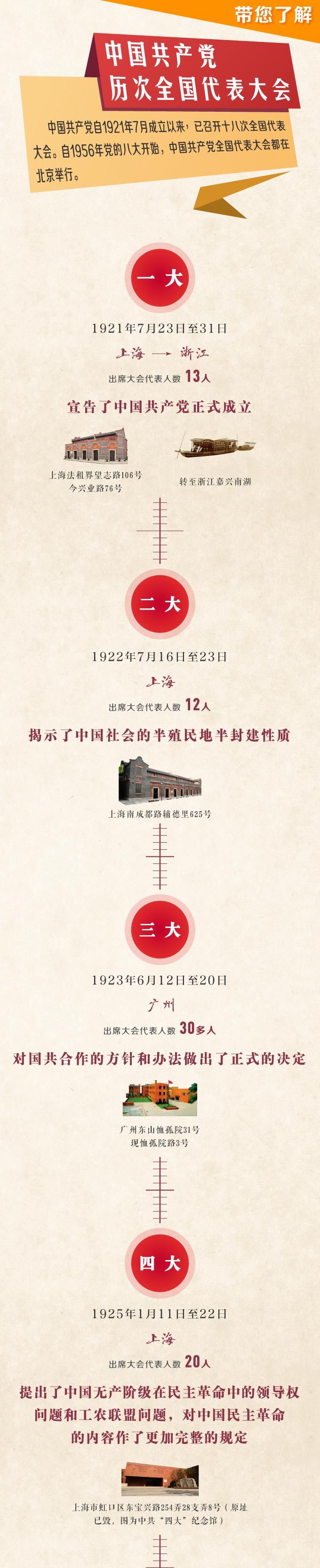 金秋时节,全党全国各族人民迎来了中国共产党第十九次全国代表大会将于10月18日在北京召开的特大喜讯,广大干部群众欢欣鼓舞,倍感振奋,表示要以饱满的热情和昂扬的精神,以优异的成绩迎接党的十九大胜利召开。小编带您了解:中国共产党历次全国代表大会。