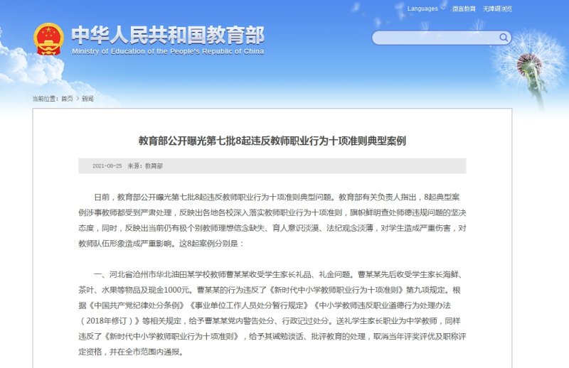 日前,教育部公开曝光第七批8起违反教师职业行为十项准则典型问题。教育部有关负责人指出,8起典型案例涉事教师都受到严肃处理,反映出各地各校深入落实教师职业行为十项准则,旗帜鲜明查处师德违规问题的坚决态度,同时,反映出当前仍有极个别教师理想信念缺失、育人意识淡漠、法纪观念淡薄,对学生造成严重伤害,对教师队伍形象造成严重影响。这8起案例分别是: