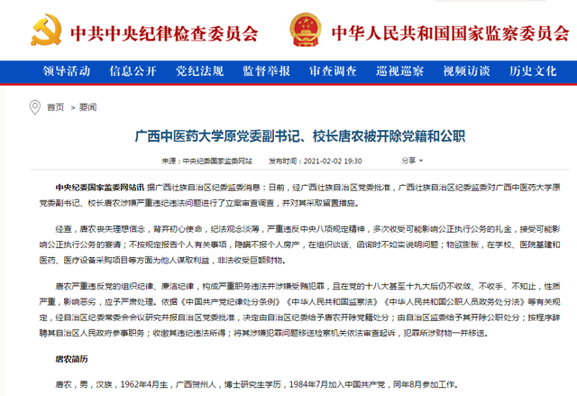 广西中医药大学原党委副书记、校长唐农被开除党籍和公职