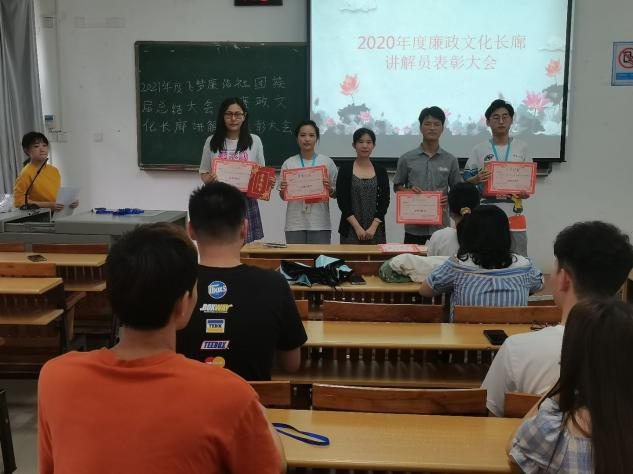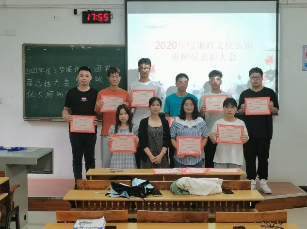 议伊始,会长谭雯月首先感谢了廉洁社团各位成员为社团会做出的贡献,也希望大家能继续坚持,把工作做好。尔后,谭雯月会长宣读讲解员获奖名单,郝科景等四名成员获得“金牌讲解员”,莫玉香等六名成员获得“星级讲解员” ,除此之外,还有若干名成员获得优秀讲解员称号。接着指导老师钟洁为获奖代表们颁发奖状,并与获奖成员合影拍照。同时,钟洁老师希望大家继续坚持,将飞梦廉洁社团的工作做好,做优,争取进一步将廉洁社团发扬光大。会议最后,钟洁老师与所有讲解员合影留念。就此,本次会议圆满结束。