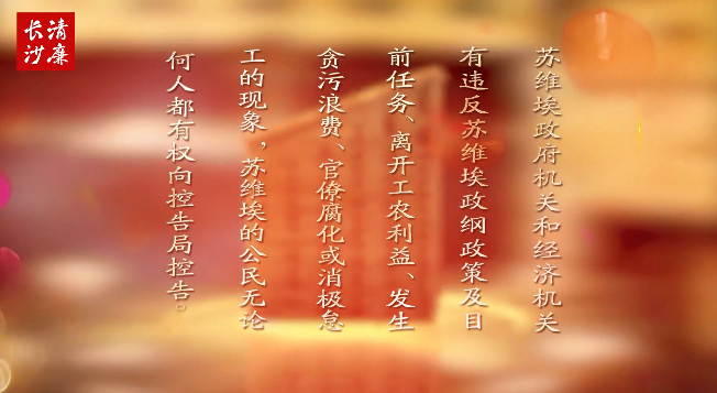 右面写着控告范围:“苏维埃政府机关和经济机关有违反苏维埃政纲政策及目前任务、离开工农利益、发生贪污浪费、官僚腐化或消极怠工的现象,苏维埃的公民无论何人都有权向控告局控告。”左面标注着举报原则:“控告人向控告局投递的控告书,必须署本人的真姓名,而且要写明控告人住址,同时要将被告人的事实叙述清楚,无名的控告书一概不处理......”上面则写着举报办法:“......所写的控告意见书必须盖好私章才能作效力,没有盖章的概作废纸,而且还要用信套密封好,并且要注明送某机关,工农检查部控告局局长接收。”