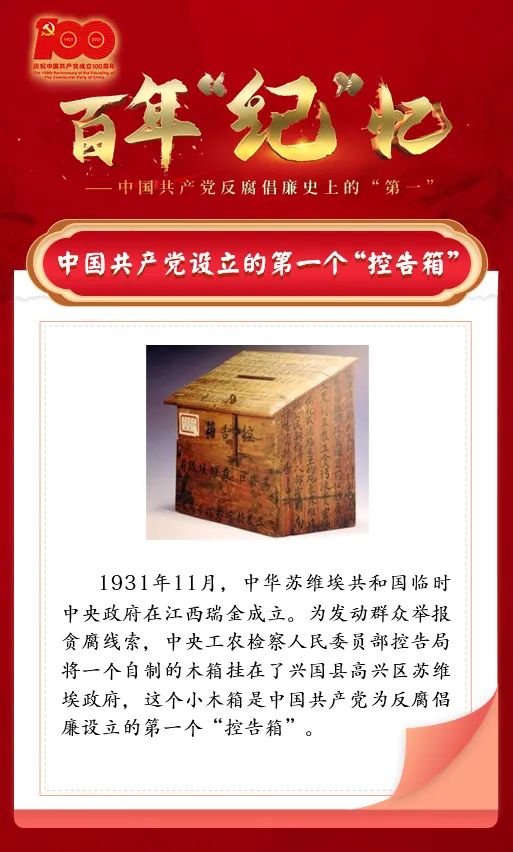 在中国国家博物馆陈列着一个小木箱,它的正面用毛笔工工整整地书写着三个大字——控告箱,它是90年前中国共产党为反腐倡廉建设设立的第一个“控告箱”。