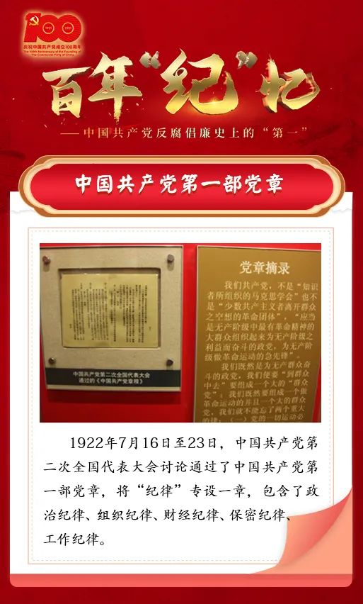第一部党章的确立,标志着中国共产党在政治、理论和组织上的完备建成。其中的“纪律”专章,为党的纪律建设提供了“制度母体”,为健全党内生活、加强党内监督指明了方向。