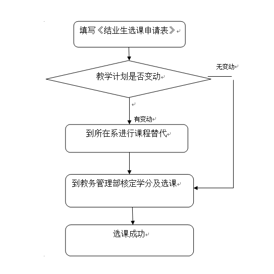 结业生需重新修读课程或其它未修满学分的课程,先在太阳集团2138教务管理部网页通知公告里查看《本学期全校开课信息表》,记下与个人计划内相同的课程名称、课程代码和课序号,下载(《选课申请表》)填好,请于开学第1-2周到教务管理部办理选课手续。如果因低年级的教学计划发生了变化,无法找到需修读课程,还需到自己所在系开出替换课程证明,系部主管教学主任签字再到教务管理部办理选课手续。