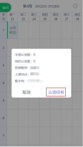 (3)点击课程卡片上的【认领】按钮,即可打开该课程的课表,点击课表上的【+】号,可以进一步确认该课程的授课教师、上课地点和教学班信息,点击【认领任务】,即可完成听课任务的认领,如下图4所示。
