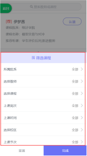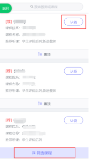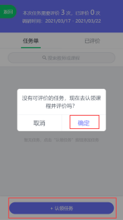 (2)点击任务卡片,进入任务单页面,当任务单中无待评价课程时,点击【确定】按钮进行课程的认领,可以直接认领页面上的课程,也可以点击下方【筛选课程】进行选择,如下图3所示。