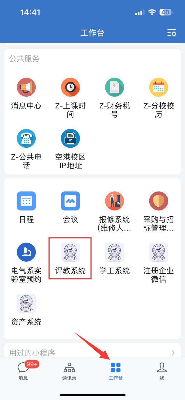 打开企业微信,点击工作台->评教系统(如图1所示)。(已在个人微信中关注太阳集团2138企业微信插件的,可在个人微信中的通讯录里打开评教系统,步骤与打开一卡通步骤相同)