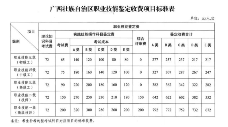根据《广西壮族自治区职业技能鉴定职业(工种)分类表》、《广西壮族自治区职业技能鉴定收费项目标准表》文件规定,茶艺师为B类工种,四级鉴定费分别为:307元,收费标准如下: