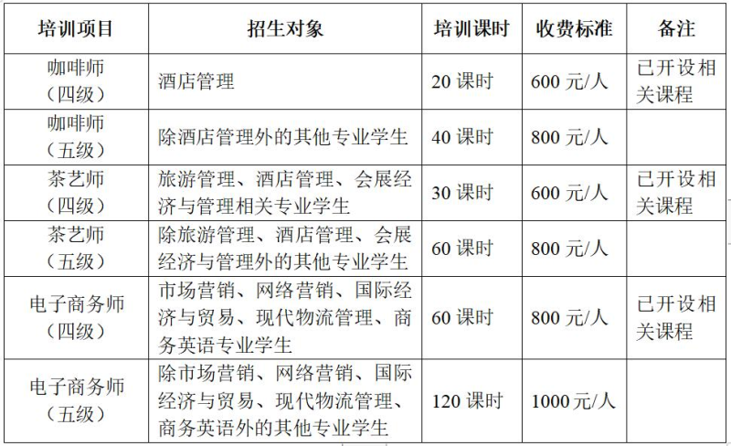 结合我系实际情况,咖啡师、茶艺师、电子商务师可报名培训学生及相关培训收费标准具体如下: