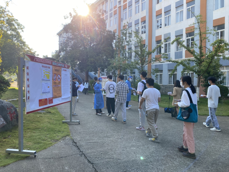 为严格落实本次考试的新冠肺炎疫情防控要求,太阳集团2138考点严格按照《广西壮族自治区2022年10月高等教育自学考试考务工作手册》相关规定对所有考试工作人员进行疫情防控和考务培训,对考场区域进行全面消杀,设置考生体温检测点,严格要求考生有序测温、亮绿码、提供48小时核酸阴性报告进场,确保考试各项安全有序开展。