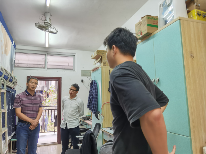唐承泽副书记在走访中与学生们亲切交谈,询问他们的学习、生活情况,倾听他们对学校的意见和建议,并对学生们提出了三点希望:一是希望同学们要爱护宿舍的环境,保持宿舍的干净整洁,努力营造良好的宿舍环境;二是希望增强责任意识,提高沟通能力,合理高效利用学校的意见反馈渠道,多为学校发展提供建设性意见,实现从“客”到“主”的角色转变,爱校荣校,努力实现自我管理、自我提升;三是希望同学们要刻苦学习,大学是同学们练就本领的关键阶段,要利用好学校提供的各种平台,不断提升自己,为自己今后的工作打下坚实的基础。