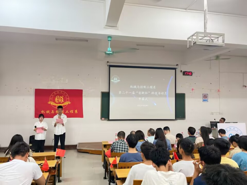 2022年10月24日下午5:40,我系于启智楼8203教室举行第二十一届“创新杯”科技活动月开幕式。本次出席开幕式的领导嘉宾有:系主任黄荣学,党总支书记袁斌,党总支副书记兼学工组组长李杰,系副主任甘卓权,支部副书记奚富由,辅导员丁珊珊老师、蓝慧萍老师、唐庆老师、孙一楠老师、丘东林老师,金工车间指导老师石毅科老师以及我系学生会工作人员和学生代表。