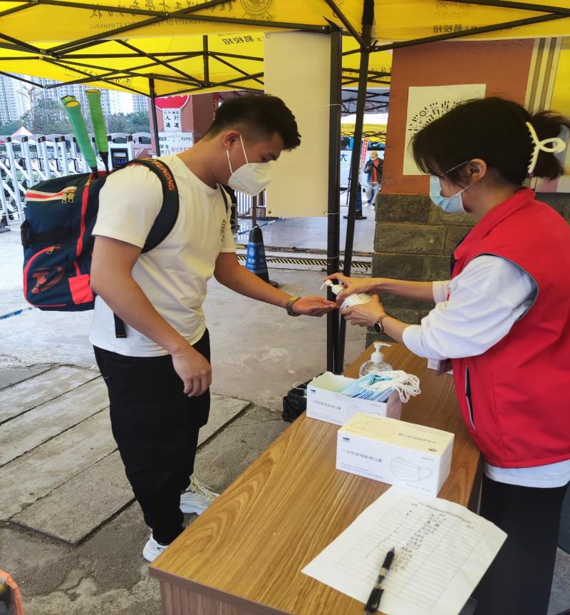 6号早上八点钟,志愿者来到校门口布置场地和分配工作。我系志愿者严格按照“消、审、查、验、测、换”的“六步入校”原则,组织学生完成返校流程:引导入校学生进行卫生消杀、检查钉钉返校审批、检查48小时核酸检测报告、查验”四码“、体温检测、更换新口罩,而后进入校园。