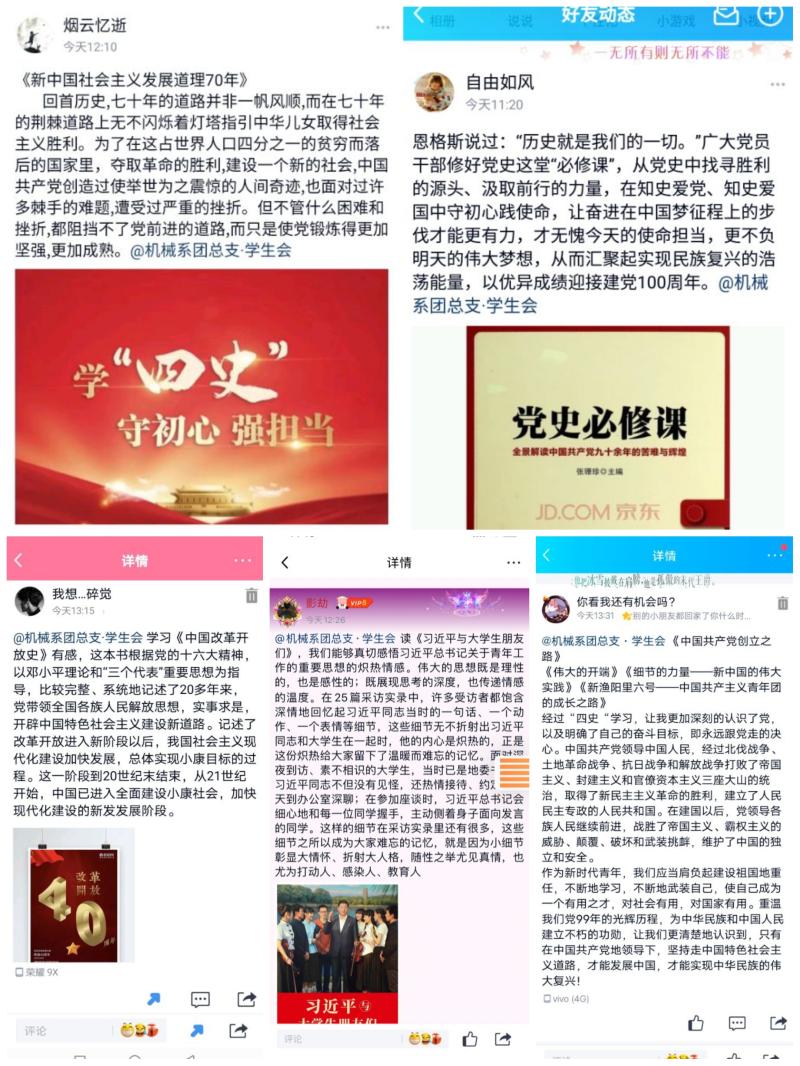 机械青年团员不仅重视自身的学习,也始终不忘自己共产党接班人的身份与职能,努力做好“四史”学习教育的宣传者、参与者、推动者。大家选择自己学习的四史图书利用QQ空间、朋友圈等社交途径宣讲自己的心得。希望我们同学坚定理想信念,牢记总书记的嘱托,成为堪大任的筑梦人,始终保持艰苦奋斗的前进姿态,同亿万人民一道,在实现中华民族伟大复兴中国梦的新长征路上奋勇搏击。