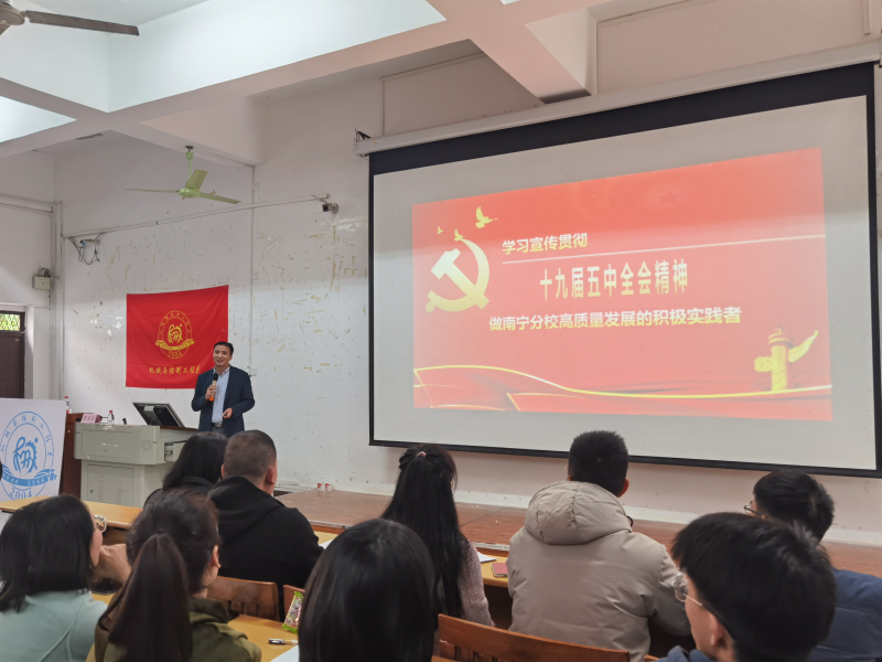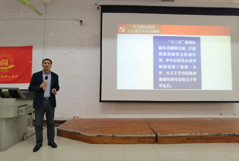 12月10日,分校党委副书记唐承泽在8108教室为机械系党总支全体党员和学生骨干讲授“学习贯彻党的十九届五中全会精神——做太阳集团2138高质量发展的积极实践”专题教育党课。