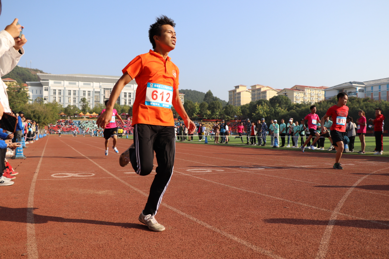 校运会男子200米预赛第八组,来自机械系的谭魁武同学抵达终点