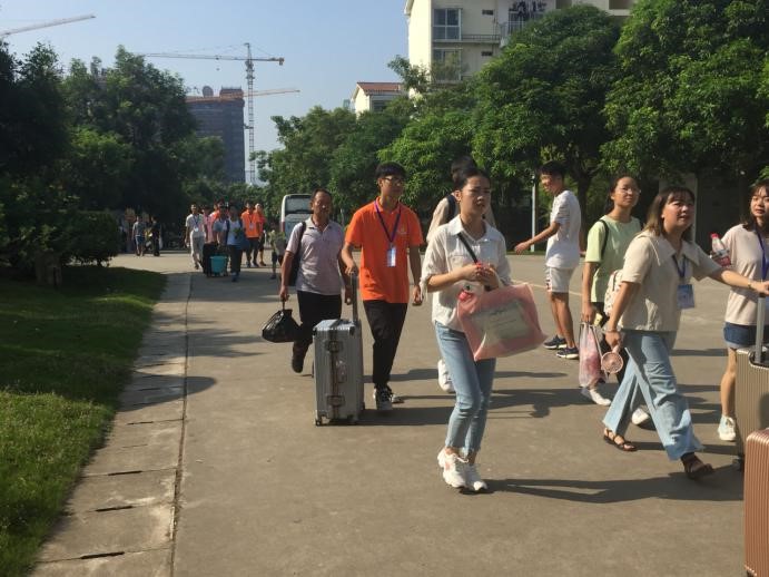 前往体育馆的路上,志愿者们顶着炎热的太阳,帮助新生拿行李,引领他们前去报道。路上为新生介绍周围的建筑物。