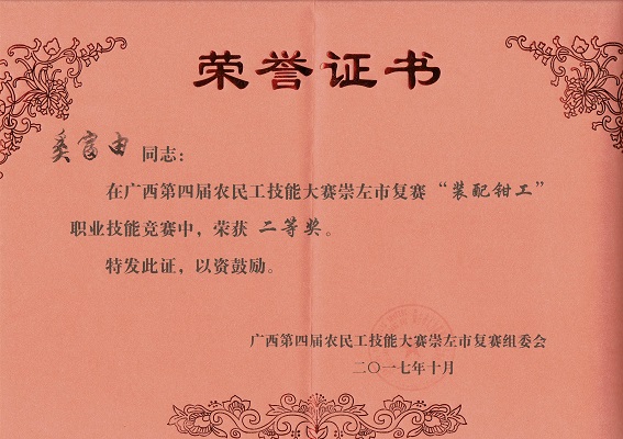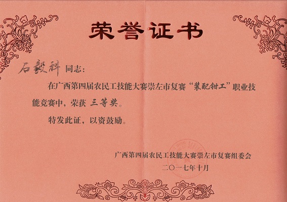 比赛当天各个参赛选手挥汗如雨、奋力拼搏,经过一天激烈的角逐和竞争,我系师生在装配钳工比赛项目成绩优异,劳英慧获得一等奖并被授予“崇左市技术能手”称号,奚富由、石毅科分别获二、三等奖。接下来,劳英慧、奚富由将代表崇左市参加广西第四届农民工技能大赛装配钳工决赛,争取更好的成绩。